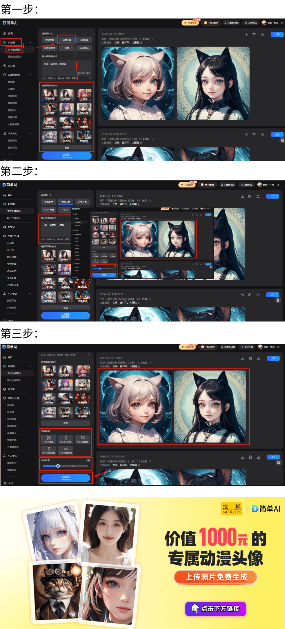 点击这里,个性头像一键生成,或者正在微信小法式搜刮【简单AI】。正在选择画什么模块选择动漫头像第三步:选择画面气概、生成比例及生成数量,AI画图东西的呈现正益处理了这个烦末路。若是不敷对劲多测验考试啊~这个行话叫做“抽卡”,一键生成属于你的头像!